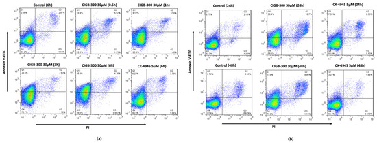 Apoptotic profile of CIGB-300 and CX-4945 in NCI-H460 cell line at IC50 values using a double staining with Annexin V-FITC and PI: (a) Short incubation times; (b) Later incubation times.
