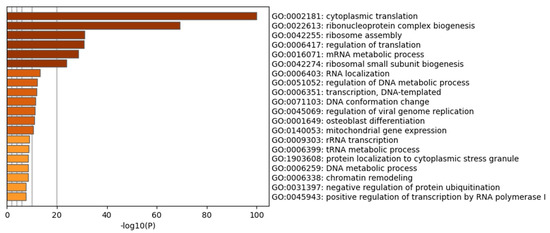 Enrichment analysis of CIGB-300 interacting proteins in NCI-H460 cells. Biological processes significantly represented in the peptide interaction profile (p-value < 0.01, enrichment factor > 1.5), were identified using Metascape gene annotation and analysis resource (https://metascape.org/, accessed on 1 September 2022).