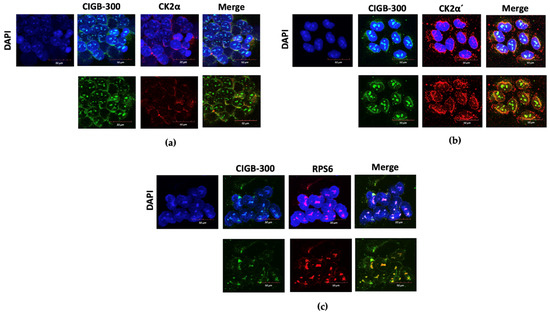 To additionally support the in vivo pulldown data, we looked for the in situ physical proximity of CIGB-300 with the above-mentioned proteins by confocal microscopy. Data from microscopy panels showed the well-defined location of CIGB-300 in cytosol and the perinuclear and nucleolus compartment of NCI-H460 cells. The peptide mainly remained in the nucleolus of cells (Figure 6). In the case of CK2 subunits, CK2α and CK2β showed a preferential location in cytosol and in the perinuclear compartment of cells, as previously reported (Figure 6a and Figure S3) [21], whereas CK2α′ was also located in the cell nucleolus, similar to CIGB-300 (Figure 6b). Overall, the main interactions between CIGB-300 and each CK2 subunit (Merge panel of Figure 6a,b and Figure S3) were in cytosol and in a minor proportion in the perinuclear compartment of cells. The interaction of CIGB-300 with RPS6 protein was at the nucleolus, where this protein was mainly localized (Figure 6c).