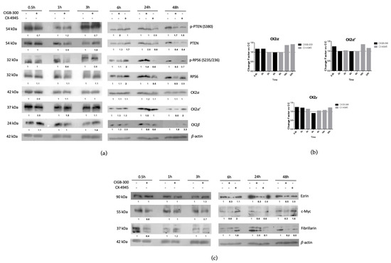To explore the regulation of CK2 levels by CIGB-300 treatment, we firstly performed time-course experiments focused on the regulation of each CK2 subunit by Western blot and qPCR assays. Furthermore, we analyzed the levels of PTEN, RPS6 and other proteins related to CK2 signaling in NCI-H460 cells. Importantly, data from Figure 7a show that CIGB-300 and CX-4945 treatment altered the CK2α′ and CK2β expression levels at longer incubation times, and no evident fluctuations in the CK2α catalytic subunit were observed. Interestingly, mRNA levels of CK2 subunits seemed to show a discrete up-regulation (no more than 1.5-fold) at earlier times with CIGB-300 treatment and longer incubation times for CX-4945 treatment (Figure 7b). Likewise, data from time-course experiments indicated that relevant inhibitory effects of p-PTEN (S380)/PTEN and p-RPS6 (S235/236)/RPS6 were observed from 6 h to 48 h post treatment. Otherwise, the regulation of other molecular cancer markers was more noticeable at longer incubation times of treatment (Figure 7c), except in the case of c-Myc and Fibrillarin proteins, where a reduction at earlier times after CIGB-300 incubation is also evident.