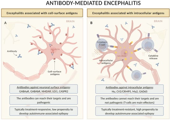 Still, today, as in the Corsellis’ description, the diagnostic criteria of LE include short-term memory loss, seizures, and psychiatric manifestations rapidly progressing in less than 3 months []; however, the historical concept of LE as a phenotype typically associated with cancer has changed dramatically in the last decade []. This paradigm shift followed the description of LGI1-Ab encephalitis [], now considered to be the most frequent form of LE [], which is typically non-paraneoplastic and almost always associated with seizures [,]. This Ab belongs to a family that targets cell-surface or synaptic proteins, which includes NMDAR (the first of the group to be discovered by Dalmau and collaborators in 2007 []), but also AMPAR, GABAaR and GABAbR, among others []. Some of these Abs are associated with isolated or predominant limbic involvement, while others (e.g., NMDAR) are associated with a more widespread (limbic and extra-limbic) form of autoimmune encephalitis []. Neuronal surface Ab-mediated encephalitides are different in several aspects compared with encephalitides associated with onconeural Abs (Figure 1): (i) the association with cancer is less strong, with the proportion of paraneoplastic cases depending on the type of Ab as well as demographic features of the patients (e.g., age and smoking habit), (ii) neuronal surface Abs are pathogenic, and (iii) the response to treatment is usually more satisfactory []. Despite these differences, it is important to note that paraneoplastic and non-paraneoplastic cases may be clinically indistinguishable, justifying a comprehensive tumor search in all patients with AE [].