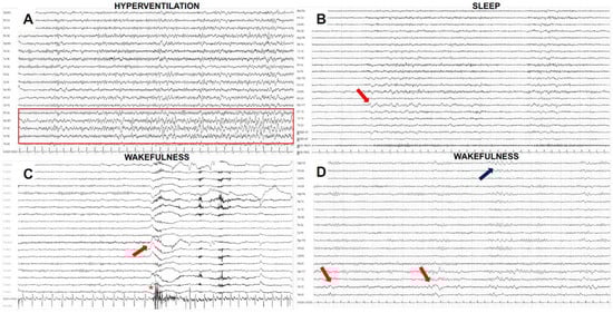EEG is very useful also in AE cases associated with LGI1 and CASPR2 Abs. Despite the frequency of temporal lobe seizures in these populations, interictal epileptiform discharges (IEDs) are rare, mainly located on temporal or fronto-temporal regions with a bilateral and asynchronous distribution [,,]. A striking sensitivity to hyperventilation has been observed [,,,]. Additionally, sleep can trigger IEDs onset []. In our experience, however, sleep is less effective in triggering epileptic abnormalities than in other forms of temporal epilepsies (unpublished observation). FBDS, a pathognomonic manifestation of anti-LGI1 encephalitis, can be EEG negative, even though some patients show an abnormal EEG pattern consisting of a large slow wave in the frontopolar, frontal or central area preceding the tonic contraction of the contralateral arm by at least 700 ms [,,]. Sometimes, FBDS can appear just after an electrodecremental event []. Figure 2 shows some paradigmatic EEG findings in patients with AE from our experience.