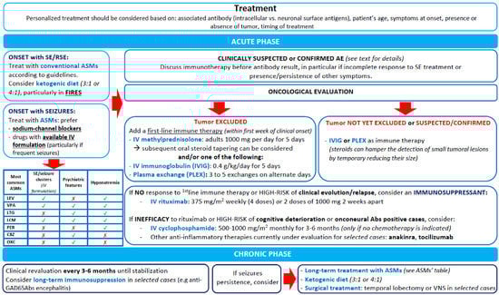 Apart from immunotherapy, the treatment of autoimmune SE does not differ from that of SE due to other etiologies. It relies on benzodiazepines as first-line treatment, intravenous ASMs as second-line and general anesthesia in case of refractory SE (RSE) []. There is no evidence regarding the most effective ASMs in case of autoimmune SE; nevertheless, an attempt with sodium channel blockers (e.g., lacosamide), which seem to be more effective in AE, should be considered. Perampanel, a selective antagonist of AMPA receptors, may be useful too, as AMPA receptors are over expressed during sustained epileptic firing []. Moreover, experimental data show that perampanel may decrease pro-inflammatory cytokines and interfere with apoptotic processes [].