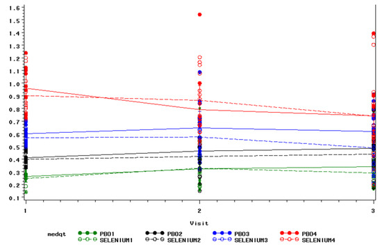 To assess damage of lipid, excretion of 8-isoprostane-F2α was measured in the urinary since the urinary concentration of this metabolite is considered to be a whole-body index of lipid peroxidation. The concentration of 8-isoprostane-F2α was not significantly lower in the selenium group at either 6-month (p = 0.46) or the 12-month timepoint (p = 0.70). Because individuals with high levels of lipid peroxidation respond to antioxidant interventions to a greater extent [49], a post hoc analysis (change over time by baseline quartile) was performed. There was no evidence of a differential effect of the intervention by baseline quartile. 8-ISOPGFα2 for those in the upper quartile at baseline is marginally lower at 12 months in both groups, while for those in the lower quartile, it is marginally higher in both groups, suggesting regression to the mean (Figure 2).