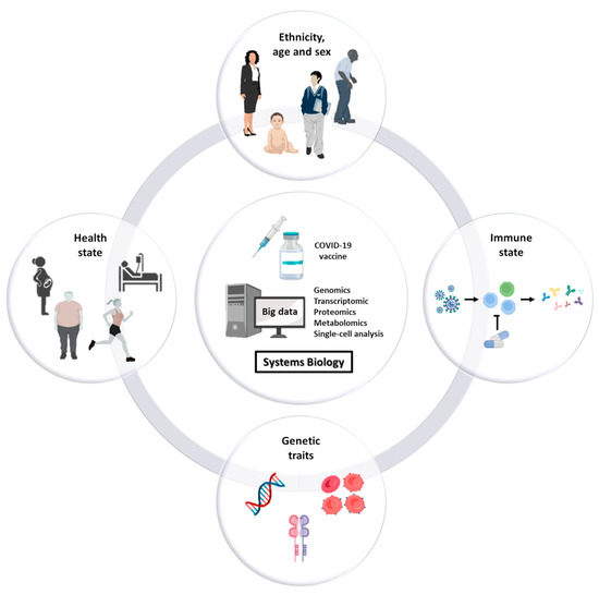 The goal of personalized vaccination is to immunize and protect individuals that are vulnerable to infection, that are responsive to the vaccine and that at the same time are unlikely to develop serious adverse events in the short and long term. High-throughput omics technologies and systems biology for computing big data are instrumental to the identification of the cohort of individuals needing vaccination with a high benefit/risk ratio, taking into account all the factors influencing the efficacy (and safety) of the vaccine, namely sex, age (newborn/infant/adults/elders), immune state (e.g., immunodeficient or immunocompromised vs. immunocompetent; naturally immunized after infection), health state (presence of co-morbidities), immunosuppressive therapies, genetic traits, and others (Figure 1).