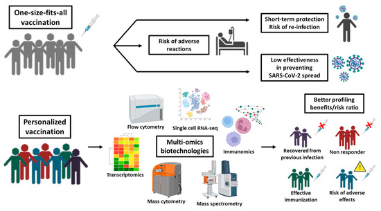 Even more relevant and timely is the possibility offered by the multi-omics technologies in combination with other serological and clinical parameters to profile those individuals for which vaccination would be more beneficial, while excluding those who would not benefit because they are already protected and not particularly susceptible to developing the disease in a severe form and who would be easily treated with available therapies [58]. For instance, immunocytomics could help determine the pool of T and B memory cells that specifically react to common epitopes of previous infection or vaccination and potentially provide protection against a family of viruses sharing those epitopes. These infection-recovered subjects can be further evaluated in light of vaccinomics guidance to determine the most optimal health interventions to prevent or minimize adverse effects [22]. It has been shown that infection-recovered subjects show similar or better protection from COVID-19 than vaccinees in terms of risk of re-infection [58,59,60,61,62], and therefore could be exempted from vaccination. Diverse serious side effects of vaccination in previously naturally immunized subjects have been reported. For instance, myopericarditis was observed following the first dose of the mRNA-COVID-19 vaccine in a patient recovered from mild COVID-19 three months before vaccination [63].