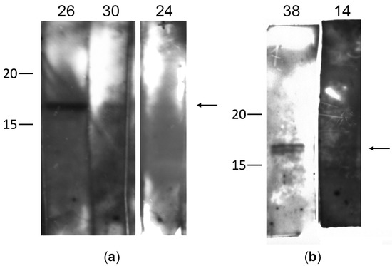 Detection of autoantibodies to γ-synuclein in the serum of patients with glaucoma by immunoblotting: (a,b) correspond to different independent membranes divided into strips. Each strip of membrane was incubated with a serum sample from one patient. On the left, the molecular weight (kDa) is indicated according to the protein ladder. The numbers 14, 24, 26, 30, 38 indicate the numbers of serum samples from patients with glaucoma, in which autoantibodies to γ-synuclein (17 kDa) were detected. The arrow on the right marks the band corresponding to γ-synuclein.