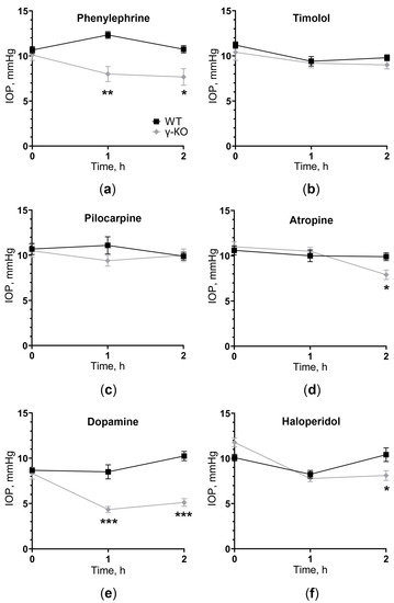 We used agonists and antagonists for the three main mediator systems that control IOP: adrenergic agonist phenylephrine, adrenergic antagonist timolol, cholinergic agonist pilocarpine, cholinergic antagonist atropine, dopamine agonist dopamine, and dopamine antagonist haloperidol. There was a difference in the dynamics of changes in IOP between the group of γ-KO mice and WT mice after instillation into the eyes of mice with drugs that affect one of the three mediator systems.