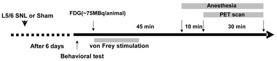 All PET scans were performed using microPET Focus220 (Siemens Co., Ltd., Knoxville, TN, USA), which was designed for the high-resolution imaging of laboratory small animals, as previously described []. As shown in Figure 1, seven days after the SNL surgery, each rat underwent tail vein cannulation under anesthesia with a mixture of 1.5% isoflurane and nitrous oxide/oxygen (7:3) before the PET scan. After more than an hour of recovery, the free-moving rat received an intravenous injection of 18F-FDG (ca. 75 MBq/0.4 mL) in the home cage. Immediately after the FDG injection, the SNL rats were placed in the plastic cage and the left hind paw was stimulated every 30 s for 20 min with the von Frey filaments two levels higher than the corresponding PWT. The paw withdrawal rate was calculated as a percentage of positive response to total von Frey stimulations. The sham-operated control rats were kept in the home cage after the FDG injection. After a 45-min uptake period, the rats were anesthetized with a mixture of 1.5% isoflurane and nitrous oxide/oxygen (7:3), and positioned in the gantry of a PET scanner. Fifty-five minutes after receiving the 18F-FDG injection, a 30-min emission scan was performed with 400–650 keV as the energy window and 6 nsec as the coincidence time window. A thermocouple probe was inserted into the rectum to monitor the rectal temperature. The body temperature was maintained at approximately 37 °C with a heating blanket during the PET scan. The emission data were acquired in the list mode. The acquired data were sorted into a single sinogram. The data were reconstructed by standard 2D filtered back projection (FBP) with a Ramp filter and cutoff frequency of 0.5 cycles per pixel, or by a statistical maximum a posteriori probability algorithm (MAP), 12 iterations with point spread function (PSF) effect.