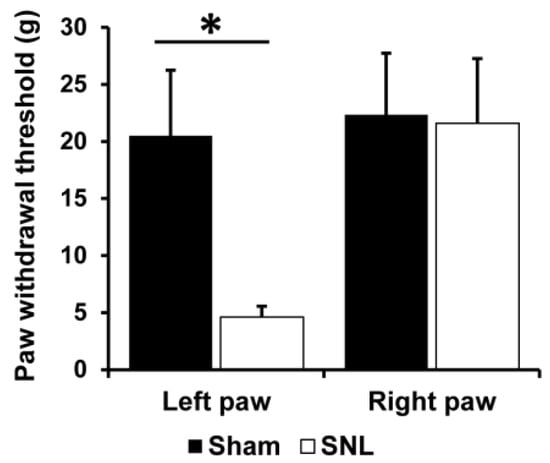 SNL is one of the popular neuropathic pain models in rodents that evoked mechanical allodynia restricted to the ipsilateral hind paw for at least 2 weeks []. To examine mechanical allodynia, the von Frey behavior test was performed in the SNL (n = 10) and sham-operated groups (n = 12) one day before the PET scan. As shown in Figure 2, the PWT in the ipsilateral hind paw (left hind paw) was significantly decreased in the SNL group compared with that in the sham-operated group (p < 0.05, two-tail unpaired t-test). In contrast, the PWT in the contralateral hind paw of SNL rats did not show any significant change. These results indicate that mechanical allodynia was developed in the ipsilateral hind paw but not in the contralateral hind paw of SNL rats approximately one week after SNL treatment.