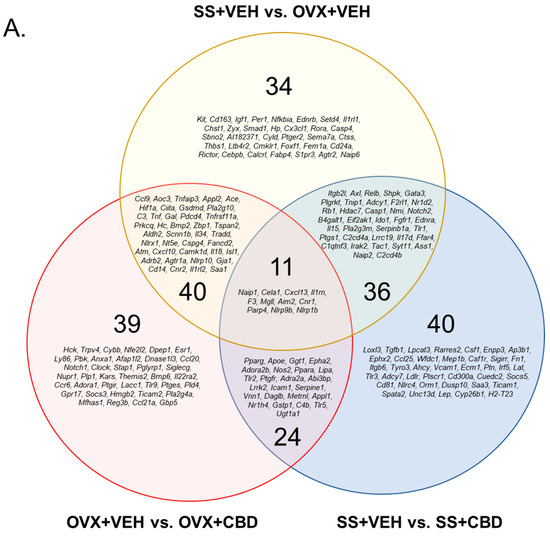 Comparing VEH- and CBD-treated OVX groups, there was a total of 2585 differentially expressed genes (DEGs, q < 0.05) of which 1334 genes were upregulated and 1255 were downregulated (Table 1). A comparison of VEH- and CBD-treated SS groups revealed 14,508 DEGs (q < 0.05) where 964 genes were upregulated and 13,544 were downregulated (Table 1). There were 3162 DEGs (q < 0.05), 1552 increased and 1610 decreased, due to a loss of ovarian E2 (SS+VEH vs. OVX+VEH).