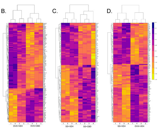 For the OVX+VEH vs. OVX+CBD comparison, CBD treatment resulted in the downregulation of 78 of the 114 differentially expressed inflammatory pathway genes (Figure 1B). In contrast, for the SS+VEH vs. SS+CBD comparison, CBD treatment resulted in the upregulation of 63 of the 111 differentially expressed inflammatory pathway genes (Figure 1C). A similar heatmap pattern was observed for the SS+VEH vs. OVX+VEH comparison where 71 of 121 differentially expressed inflammatory pathway genes were increased due to ovarian E2 deficiency (Figure 1D).