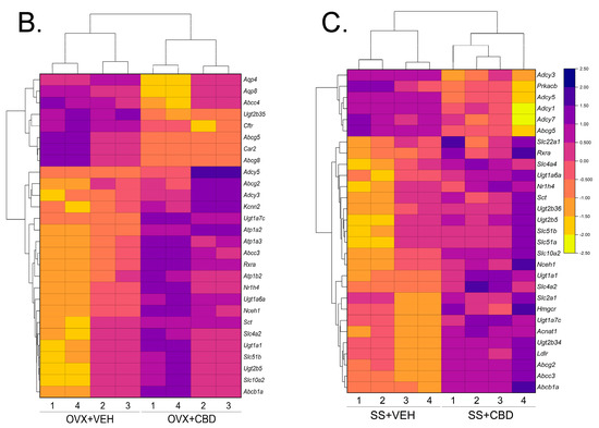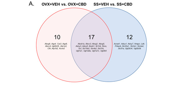 Relative to VEH-treatment, the CBD-treated OVX group had 27 DEGs involved in bile secretion and the CBD-treated SS group had 29 DEGs (Figure 2A and Supplementary File S2). The OVX+VEH vs. OVX+CBD and SS+VEH vs. SS+CBD comparisons had 17 DEGs (Abcb1a, Abcc3, Abcg2, Abcg5, Adcy3, Adcy5, Nceh1, Nr1h4, Rxra, Sct, Slc10a2, Slc4a2, Slc51b, Ugt1a1, Ugt1a6a, Ugta7c, Ugt2b5) in common, indicating that these changes to the bile secretion pathway were CBD-induced and unrelated to surgery (Figure 2A and Supplementary File S2). For OVX+VEH vs. OVX+CBD, all 17 DEGs were upregulated due to CBD (Figure 2A,B and Supplementary File S2). For the SS+VEH vs. SS+CBD comparison, 14 DEGs were upregulated and 3 were downregulated by CBD (Figure 2A,C and Supplementary File S2).