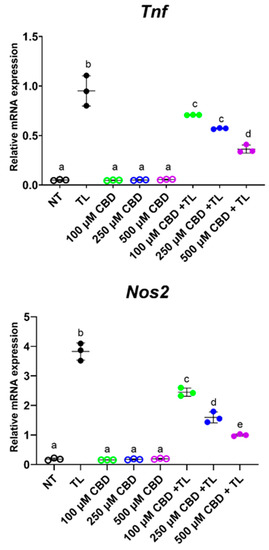 Compared to vehicle treatment, the combined TNFa and LPS (TL) treatment of ileal organoids induced the gene expression of inflammatory markers Nos2 and Tnf (Figure 3). Organoids treated with CBD concentrations of 100 or 250 µM suppressed the TL-induced expression of Tnf and Nos2 where the latter showed a dose-dependent effect. Organoids treated with 500 µM CBD also appeared to decrease the TL-induced expression of Tnf and Nos2; however, this reduction may be due to the lower viability of the organoids with the 500 µM CBD dose (Figure S5). The other treatments resulted in organoid viability which was similar to NT (Figure S5). CBD treatments alone did not alter the expression of Nos2 and Tnf (Figure 3). The mRNA levels of Il1b and Il6 were also assessed by qPCR but were not detected.