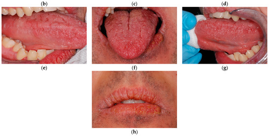 Patient 1, clinical lesions. (a) Palate. (b) Right buccal mucosa. (c) Gingiva. (d) Left buccal mucosa. (e) Right lateral lingual border. (f) Tongue. (g) Left lateral lingual border. (h) Labial vermilion and perioral skin.