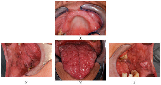 At the oral examination, in addition to the lesions reported by the dental practitioner, a verrucous aspect and mild hypertrophy of the gingiva surface was also observed. The clinical aspect was of multiple and sessile papules, with smooth surfaces, white–pink color, and of different sizes (<5 mm), showing a cobblestone pattern.
