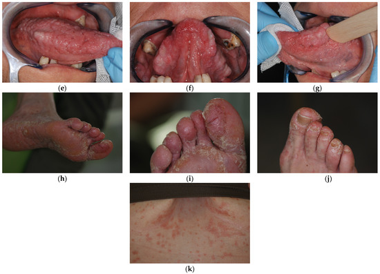 Patient 2, clinical lesions. (a) Palate. (b) Right buccal mucosa. (c) Tongue. (d) Left buccal mucosa. (e) Right lateral lingual border. (f) Ventral tongue. (g) Left lateral lingual border. (h–j) skin lesions, foot. (k) Inframammary fold.