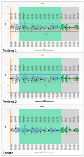 Genetic analysis revealing the same pathogenic variant in Patient 1 and 2. The MLPA analysis was conducted with Coffalyser software. The 95% confidence interval of a probe over the reference samples is depicted as a colored bar in the ratio chart. Both PTEN exon 6 in Patient 1 and in Patient 2 resulted under the arbitrary lower border (red line) which is set at 0.65 (0.95–0.3) and thus they are considered deleted in the samples. The blue line which is set at 1.25 (0.95 + 0.3) represents the upper arbitrary border. If a probe report crossed the latter boundary, this would be indicative of a duplication.