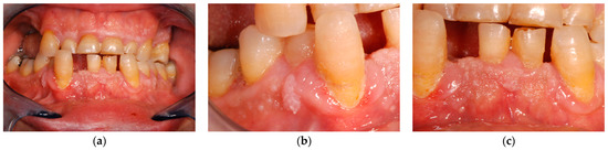 Patient 3, clinical lesions. (a) Overall view. (b,c) Gingival lumps details.