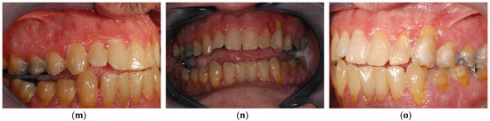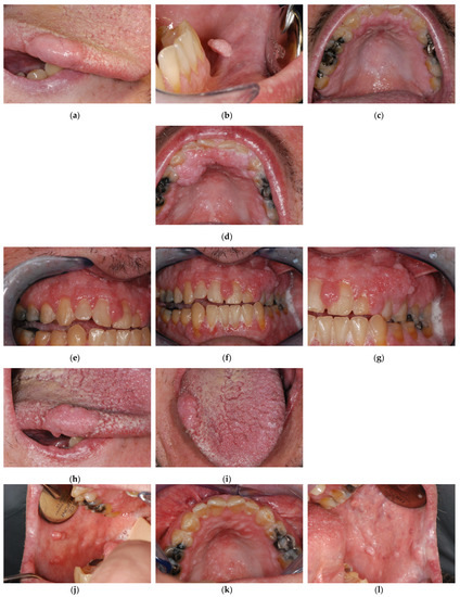 Patient 4 clinical history. First evaluation (a) Right lateral lingual border. (b) mucosal side of the lower lip. (c) Palate. After 4 years follow-up patient complained about very marked gingival hypertrophy (d) Palate. (e–g) Gingival aspect. (h,i) Tongue lesion. (j–o) mucogingival plastic surgical approach results.