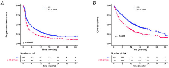 Kaplan–Meier analyses. (A) Progression-free survival (PFS) according to metastatic site (MS) number (1 MS versus ≥2 ML). (B) Overall survival according to MS number (1 MS versus ≥2 MS).