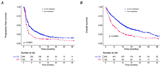 Kaplan–Meier analyses. (A) Progression-free survival (PFS) according to the presence of liver metastases (LM). (B) Overall survival according to the presence of LM.
