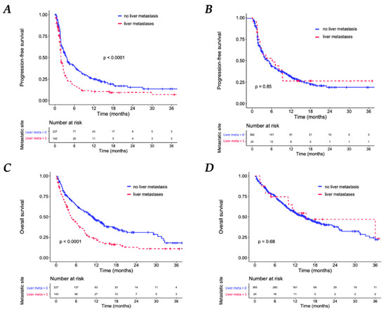Kaplan–Meier Analyses. Progression-free survival (PFS) according to the presence of liver metastases in patients with multiple sites of metastasis, (A) and in patients with only one MS (B). Overall survival (OS) according to the presence of liver metastases in patients with multiple sites of metastasis (C) and in patients with only one MS (D).