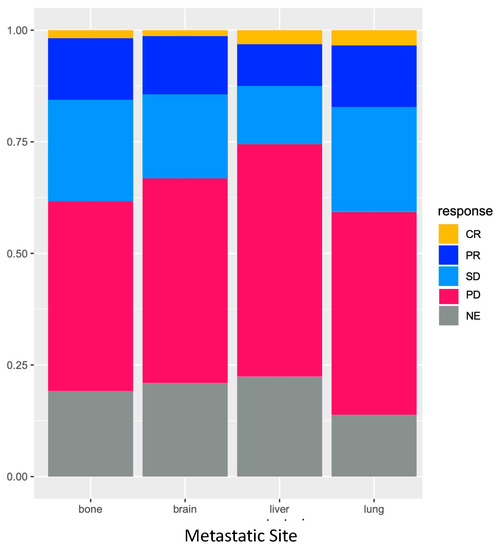 Overall response rate (ORR) according to metastatic location type in the subgroup of patients with only one site of metastasis. Legend: CR—Complete response; PR—Partial response; SD—Stable disease; PD—Progressive disease; NE—Non-evaluable.