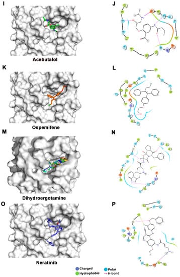 Lumefantrine, with a docking score of −5.136 Kcal/mol and an MM-GBSA score of –66.8 Kcal/mol, is at the third position in our list. It binds Mpro with several nonbonded interactions, forms a hydrogen bond with Glu166, and has a π–π interaction with His41. Lumefantrine is an antimalarial agent used in treating acute uncomplicated malaria [42]. The next drug in our list is dipyridamole, which is a phosphodiesterase-2 inhibitor that blocks the metabolism and uptake of adenosine by erythrocytes and vascular endothelial cells [43]. It causes blood vessel dilation and inhibits blood clot formation and is used as a coronary vasodilator [43]. Docking analysis suggested that dipyridamole forms both hydrophobic and hydrophilic interactions with Mpro and interacts with Tyr54, Asn142, and Leu141 through hydrogen bonding, and its docking and MM-GBSA scores are −7.2 Kcal/mol and −65.56 Kcal/mol, respectively. Acebutolol is another potential drug that showed favorable binding in our docking studies, having a docking score of −7.3 Kcal/mol and an MM-GBSA score of −61.42 Kcal/mol. Docking analysis suggested that acebutolol is stabilized by hydrophobic interactions and hydrogen bonding with Asn142, His164, Glu166, and Gln189 residues in the Mpro binding pocket. Acebutolol is a cardio-selective, β-adrenoreceptor blocking agent. Acebutolol is used for treating high blood pressure, and it reduces an irregular heartbeat [44]. Ospemifene is a nonhormonal estrogen-receptor modulator that is used for the treatment of dyspareunia [45,46]. This drug also forms hydrophobic interactions and hydrogen bonding and interacts with Thr190 in the binding pocket, with −6.6 Kcal/mol docking and −60.68 Kcal/mol MM-GBSA scores. The next drug in this list is dihydroergotamine, a derivative of ergotamine and mainly used for the treatment of acute migraine. It docks with a binding score of −6.3 Kcal/mol and an MM-GBSA score of −60.62 Kcal/mol. Besides hydrophobic interactions, it forms hydrogen bonds with His 41, Thr190, and Asn142. Dihydroergotamine can be administered as a nasal spray; therefore, it can potentially be effective against pulmonary indications of COVID-19 infection [47]. Neratinib and palbociclib are two other anticancer drugs that appeared in our list which are used to treat early-stage HER2-positive or HER2-negative breast cancer patients, respectively [48,49]. Neratinib is known to limit the development of cancer cells by blocking their tyrosine kinase. It forms a hydrogen bond with Cys145, Cys189, Gly143, and Glu 166 residue with Mpro protein, and its docking and MM-GBSA scores are −6.56 Kcal/mol and −59.57 Kcal/mol, respectively. Another effective drug in our top-ten list is palbociclib. It is a cancer-preventive drug that inhibits cyclin-dependent kinases. It forms a hydrogen bond with Gln189, Glu 166, and Gly 143 residue with Mpro protein, and its docking and MM-GBSA scores are −6.29 Kcal/mol and −59.51 Kcal/mol, respectively.