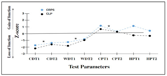The thermal and pain threshold profile. Note. CRPS—Complex Regional Pain Syndrome; CLP—Chronic Limb Pain; CDT1—Cold Detection Threshold in the involved limb; CDT2—Cold Detection Threshold in the non-involved limb; WDT1—Warm Detection Threshold in the involved limb; WDT2—Warm Detection Threshold in the non-involved limb; CPT1—Cold Pain Threshold in the involved limb; CPT2—Cold Pain Threshold in the non-involved limb; HPT1—Heat Pain Threshold in the involved limb; HPT2—Heat Pain Threshold in the non-involved limb. Gain of function (z > 1); ‘loss of function’ (z < −1). Pathologic gain of function (z > 1.96) pathologic loss of function (z < −1.96). * p < 0.05- significant differences between the affected and non-affected sides in each group.