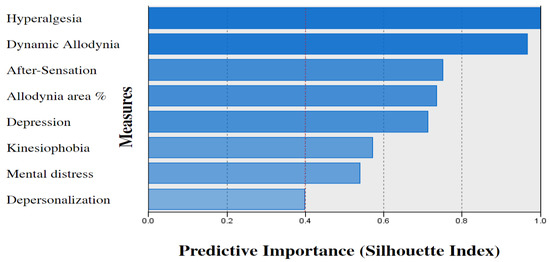 The cluster quality was fair (silhouette = 0.4); a silhouette coefficient equal to or above 0.50 indicates a good model fit [45]. The cluster cohesion indexes were good, with all measures having a silhouette value range between 0.4 and 1. The most important predictors were hyperalgesia and mechanical allodynia indicating a perfect model fit (silhouette = 1). The silhouette value of each measure (i.e., predictive importance) is shown in Figure 2.