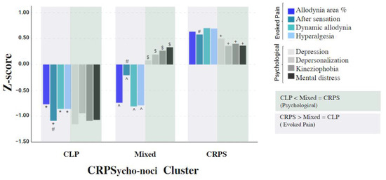 The three groups of the CRPSyco-noci cluster. Note. CRPS—Complex Regional Pain Syndrome; CLP—chronic limb pain; evoked pain and psychological measures distinguish between CLP, Mixed, and CRPS groups. All measures were z transformed. CLP showed lower values than CRPS in evoked pain measures (* CLP vs. CRPS) and CRPS showed higher values than CLP in psychological measures (+ CRPS vs. CLP). The Mixed group showed lower scores than CRPS in evoked pain measures (^ Mixed vs. CRPS) and higher scores than CLP in psychological measures ($ Mixed vs. CLP). After-sensation significantly differed in all groups (#).
