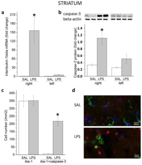 It is well-known that LPS activates microglial cells. To evaluate the activation of microglia in the right striatum and caspase-3 in these cells after LPS, antibodies to Iba1 (macrophagic-specific calcium-binding protein) and caspase-3 were employed for immunohistochemical staining. Contrary to our expectation, no significant differences were found between the LPS and SAL groups in the number of cells that were immuno-positive only for Iba1. At the same time, the number of cells that showed immunoreactivities for both Iba-1 and caspase-3 was significantly increased after LPS (Figure 1c,d). In contrast to the right striatum, no cells expressing active caspase-3 were found in the left striatum (Supplementary Materials: Additional Materials S2).