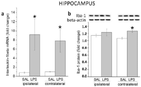 Expression levels of interleukin-1beta mRNA (a) and protein of Iba-1 (b) in ipsilateral and contralateral hippocampi 24 h following administration of LPS into right striatum. * p < 0.05 compared with an appropriate SAL group.