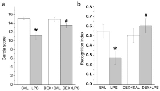 Short-term and delayed behavioral effects of LPS administered alone or with DEX. (a) The Garcia score at 24 h. Neurological scale of the LPS-treated rats significantly decreased compared to that of the SAL-treated rats. When animals were pretreated with DEX, the neurological scale of the DEX + LPS group was higher than after LPS alone. (b) The recognition index was assessed 3 months after the drug administration. LPS caused memory impairment, and this effect was prevented by DEX pretreatment. Each group of animals that were the same on (a,b) consisted of 10 rats. * p < 0.05 compared with an appropriate control group (SAL or DEX + SAL); # p < 0.05 compared with LPS group.