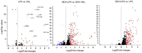 According to the criteria for screening of differentially expressed genes (DEGs): │log2 FC (fold change)│ ≥ 1 and an adjusted p value (padj) < 0.05, 33 DEGs, 29 upregulated, and 4 downregulated (Alox5, LOC500035, Tbx19, H1f4), were revealed in LPS vs. SAL (Supplementary Materials, Table S1). The pretreatment of LPS rats with DEX increased the total number of DEGs that were 161 (128 upregulated and 33 downregulated) in DEX + LPS vs. DEX + SAL (Supplementary Materials, Table S2), whereas no DEGs were detected in DEX+ SAL vs. SAL. The comparison of DEX + LPS and LPS groups revealed 112 DEGs (110 upregulated and 2 downregulated). All DEGs of the three compared pairs of groups, LPS and SAL, DEX + LPS and DEX + SAL, and DEX + LPS and LPS, at the significant level padj < 0.05, but │log2 FC (fold change)│ ≥ 0, presented in volcano plots (Figure 4). According to these criteria, only 3 DEGs, Ccdc88a, Ptprb, and RT1-N2 were found in DEX+ SAL vs. SAL (volcano plot not shown).