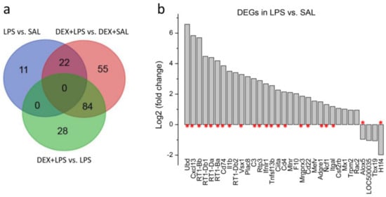 (a) Common genes among DEGs in LPS vs. SAL and DEX + LPS vs. DEX + SAL (22 genes), as well as DEX + LPS vs. DEX + SAL and DEX + LPS vs. LPS (84 genes). (b) Expression profiles of DEGs for LPS vs. SAL. Data were expressed as log2 transformation of fold changes. Asterisks indicate 22 DEGs common for LPS vs. SAL and DEX + LPS vs. DEX + SAL.