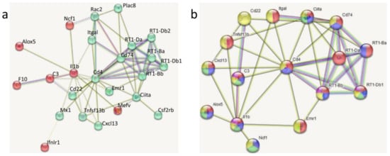 Of the 33 DEGs revealed between LPS and SAL, 9 did not fall into the protein–protein interaction (PPI) network (the number of connections/interactions = 0), which, when made from only other DEGs, was constructed of 24 nodes and 62 edges. K-means clustering of these DEGs outlined two clusters, as depicted in Figure 7a, and the biological functions of each were characterized by the Gene Ontology (GO). The cluster 1 (green) included 17 DEGs together with Cd4 and Cd74 hub genes (Cd22, Cd4, Cd74, Ciita, Csf2rb, Cxcl13, Emr1, Itgal, Mx1, Plac8, RT1-Ba, RT1-Bb, RT1-Da, RT1-Db1, RT1-Db2, Rac2, and Tnfsf13b). These DEGs were mainly enriched in immune response and immune system processes. The second cluster consisted of seven DEGs together with the Il1b hub gene (Alox5, C3, F10, Ifnlr1, Il1b, Mefv, and Ncf1), which were involved in the inflammatory response and response to stress.