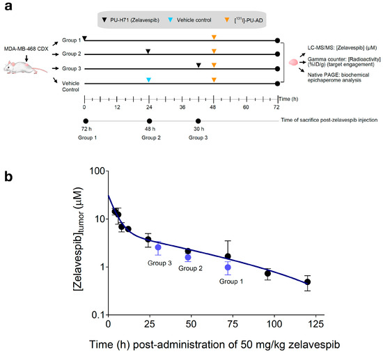 MDA-MB-468 (RRID:CVCL_0419) tumor xenografts were established on the forelimbs of female athymic nude mice (Hsd:Athymic Nude-Foxn1nu; Envigo; 5 weeks old; RRID:MGI:5652489) by subcutaneous (s.c.) injection of 7 × 106 cells in a 300 µL cell suspension of a 1:1 v/v mixture of PBS with reconstituted basement membrane (BD MatrigelTM, Collaborative Biomedical Products Inc., Bedford, MA, USA). Tumor progression was monitored using vernier calipers. For biodistribution studies, female athymic nude mice with MDA-MB-468 tumor xenografts (~200–300 mm3) on the forelimbs were injected intravenously in the tail vein with zelavespib (50 mg/kg (PU-H71.HCl formulated in 10 mM Phosphate Buffer, pH = ~6.4)) at different time points (0 (co-injection), 6, 24, and 48 h) prior to tracer administration. At designated time points post-drug administration, mice were injected intravenously in the tail vein with 0.93–1.1 MBq (25–50 µCi) of [131I]-PU-AD in 200 µL of 5% ethanol in saline. The activity in the syringe before and after administration was assayed in a dose calibrator (CRC-15R; Capintec, Florham Park, NJ, USA) to determine by difference the actual activity administered to each animal. Animals were euthanized by CO2 asphyxiation at 24 h post-administration of the radiolabeled [131I]-PU-AD tracer, and organs, including tumor(s), were harvested and weighed. 131I was measured in a 2480 WIZARD automatic gamma counter (PerkinElmer, Waltham, MA, USA) using a 260–430 keV energy window. Count data were background- and decay-corrected to the time of injection, and the percent injected dose per gram (%ID/g) for each tissue sample was calculated using a measured 131I calibration factor to convert count rate to activity and the activity was normalized to the activity injected and the weighed mass of the sample to yield the activity concentration in %ID/g.