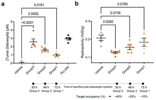 According to this study, we estimated target occupancies of 38.8%, 24.9%, and 11.3% at 30 h, 48 h, and 72 h post-single dose injection of 50 mg/kg zelavespib. Accounting for background signal (i.e., subtracting the background radioactivity signal recorded in normal tissues or organs, such as the heart) we calculated similar target occupancies, 41.5%, 22.4%, and 3.5% at 30 h, 48 h, and 72 h, consistent with the notion that little, if any, zelavespib is present in normal tissues or organs, as reported [32]. Combined with prior pharmacodynamic and efficacy studies of 50 mg/kg PU-H71 in the MDA-MB-468 xenograft [32], these data propose that intratumoral zelavespib is target-bound, with approximately half to minimal target occupancy observed in the time interval of 30 to 72 h post-administration (Figure 3b).