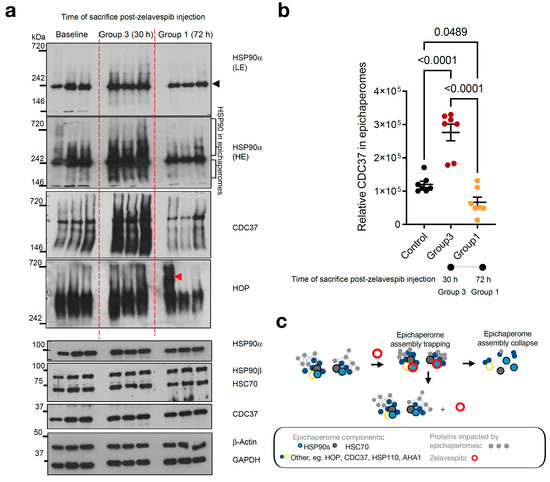 By contrast, at 72 h post-zelavespib administration, we observed a decrease in the epichaperome signal on native PAGE (approximately 4.15-fold decrease compared to 30 h). Epichaperome levels at 72 h were thus found to be lower than the baseline levels (approximately 1.8-fold decrease), while no observable change was seen in the total chaperone levels on SDS-PAGE (Figure 4a,b). This suggests that the disassembly of the epichaperomes occurred by 72 h. Whether this disassembly is due to a direct drug allosteric effect, an indirect cellular mechanism following epichaperome inhibition, or a combination of both remains unknown.