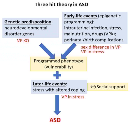 The three-hit theory of autism spectrum disorder. Vasopressin may contribute to the development of symptoms at all levels. Abbreviations: ASD: autism spectrum disorder; VP: vasopressin; KO: knockout; VPA: valproate.