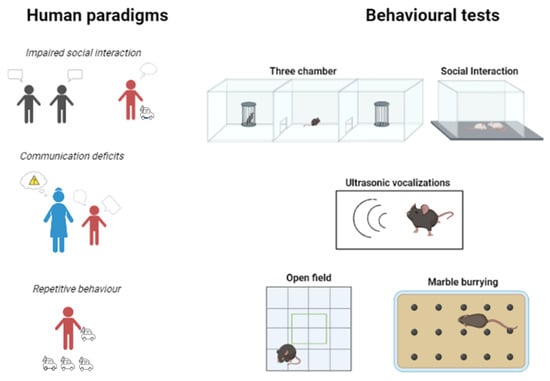 Comparison of core human symptoms with animal tests modeling them. Impaired social interaction can be modeled via the three-chamber sociability test or anxiogenic social interaction in a new cage. Communication can be measured using ultrasound vocalization, while enhanced allo-grooming in rodents—observable in an open-field—is a sign of stereotyped, repetitive behavior together with the increased number of buried marbles during the marble burying test.