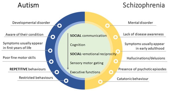 The large variation in the severity of symptoms within and across different groups hampered the ability to distinguish one disorder from another [49]. Of note, ASD and schizophrenia (SCZ) seem to overlap on many levels. Indeed, before the publication of the DSM-III [50], when ASD was first introduced as a different clinical diagnosis, autistic children were frequently diagnosed with childhood SCZ, which is characterized by abnormal perceptions of reality as well as deficits in social functioning [51]. Though ASD and SCZ are now classified as distinct disorders, they frequently co-occur and share common genetic risk factors and symptom presentations [52] (Figure 3).