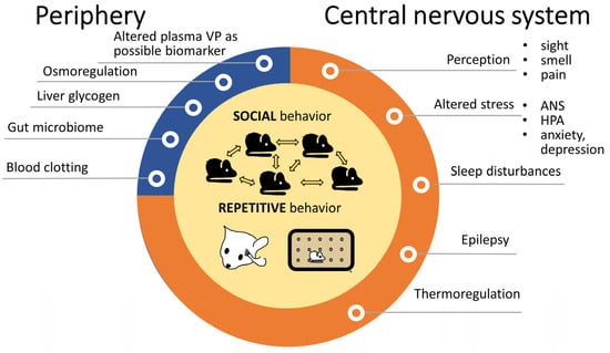 Impairments in social behavior are one of the main characteristics of ASD (Figure 3). Interestingly, both VP and OT have been connected to it and may regulate social behavior at the genetic, circulatory, neural functioning, and pharmacological levels [123]. Indeed, existing evidence suggests that VP can influence social functions already at the perceptional level and influence how sensory information is interpreted [124]. In this regard, the importance of VP in olfactory function was also confirmed before [115,116]. Moreover, VP was also found in the retina [125], VPergic fibers may project to the suprachiasmatic nucleus (SCN), the known center of circadian regulations (see later) [126,127].