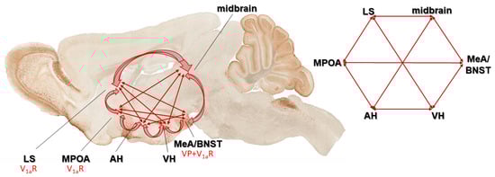 - DiBenedictis, B.T.; Nussbaum, E.R.; Cheung, H.K.; Veenema, A.H. Quantitative mapping reveals age and sex differences in vasopressin, but not oxytocin, immunoreactivity in the rat social behavior neural network. J. Comp. Neurol. 2017, 525, 2549–2570. [Google Scholar] [CrossRef]