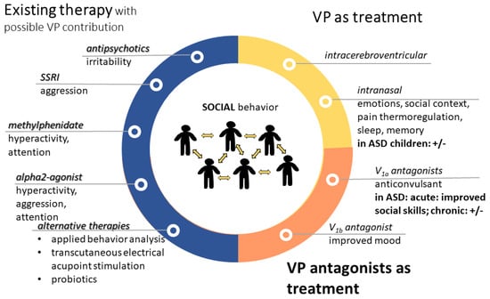 Our aim was to summarize the literature exploring the possible symptoms of ASD and frequent comorbidities with a known or suggested contribution of VP and the possible therapeutic considerations. Previous studies focused either on the role of OT [40], on social skills [41] or on treatment options [42], without attempting to present a comprehensive view on VP–ASD interaction.