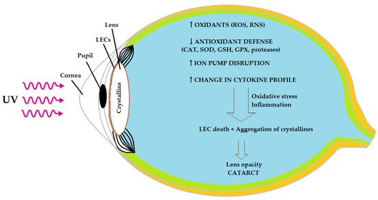 Oxidative stress and inflammation as possible causes of age-related cataract (based on [5,6,9]). ↑: increase; ↓: decrease; LECs: lens epithelial cells; ROS: reactive oxygen species; RNS: reactive nitrogen species; CAT: catalase; SOD: superoxide dismutase; GSH: glutathione; GPX: glutathione peroxidase.