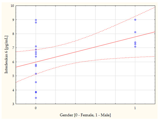 Person’s correlation coefficient between the control group concentration of interleukin 6 and gender (r = 0.47, p = 0.041).