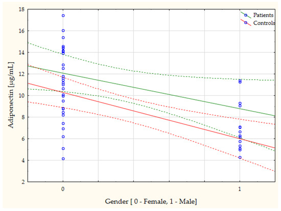 The authors’ present study showed higher serum concentrations of adiponectin in cataract patients (the entire group), versus healthy controls. In analyzing the levels of adiponectin in subgroups by gender, a higher concentration was found in males with cataract, compared to in control males. In parallel, the levels of adiponectin in females with cataract were higher than in males with cataract. Moreover, multiple linear regression (predictors: age, gender, BMI) showed that the level adiponectin was negatively correlated with gender (r = −0.46; p = 0.0005), similarly to simple linear regression (r = −0.44, p = 0.046 in the cataract patients, r = −0.64, p = 0.001 in the controls; Figure 4). These results are in line with the studies by other authors, who have also proved that the adiponectin concentration is higher in females than in males [36,37], despite the negative association between estradiol and adiponectin [36]. Adiponectin, which is the main circulating adipokine, can have both an anti-inflammatory [38,39] and pro-inflammatory properties [40]. It is mainly secreted by adipose tissue [39], but also locally in the brain and retina [41]. Higher adiponectin levels were also demonstrated, for instance, in patients with rheumatoid arthritis, compared to in healthy controls [42]. Reduced levels of adiponectin have been observed in patients with diabetes, metabolic syndrome, obesity, coronary heart disease and hypertension [43]. Adiponectin is believed to exert protective effects in eye diseases [41].